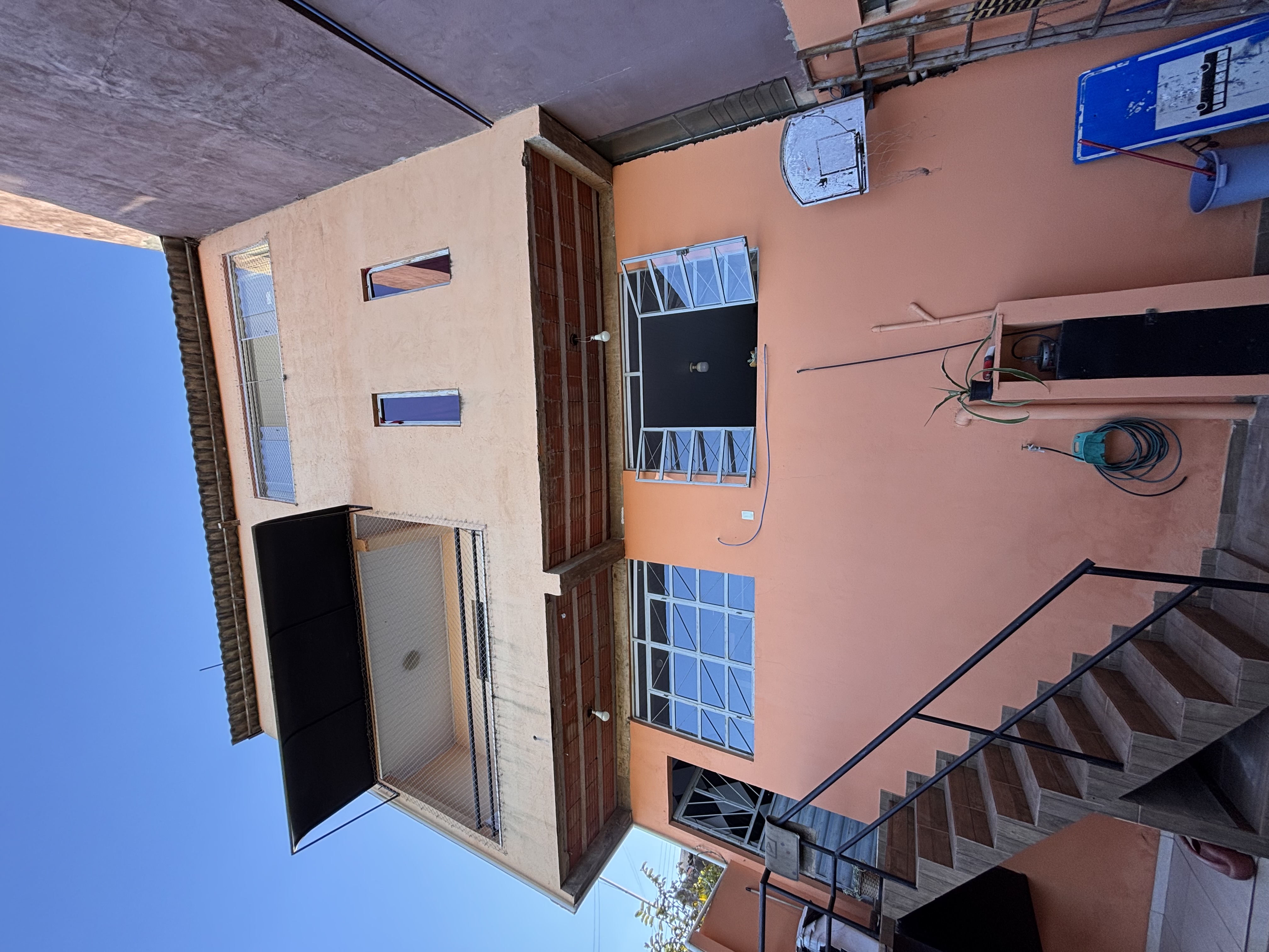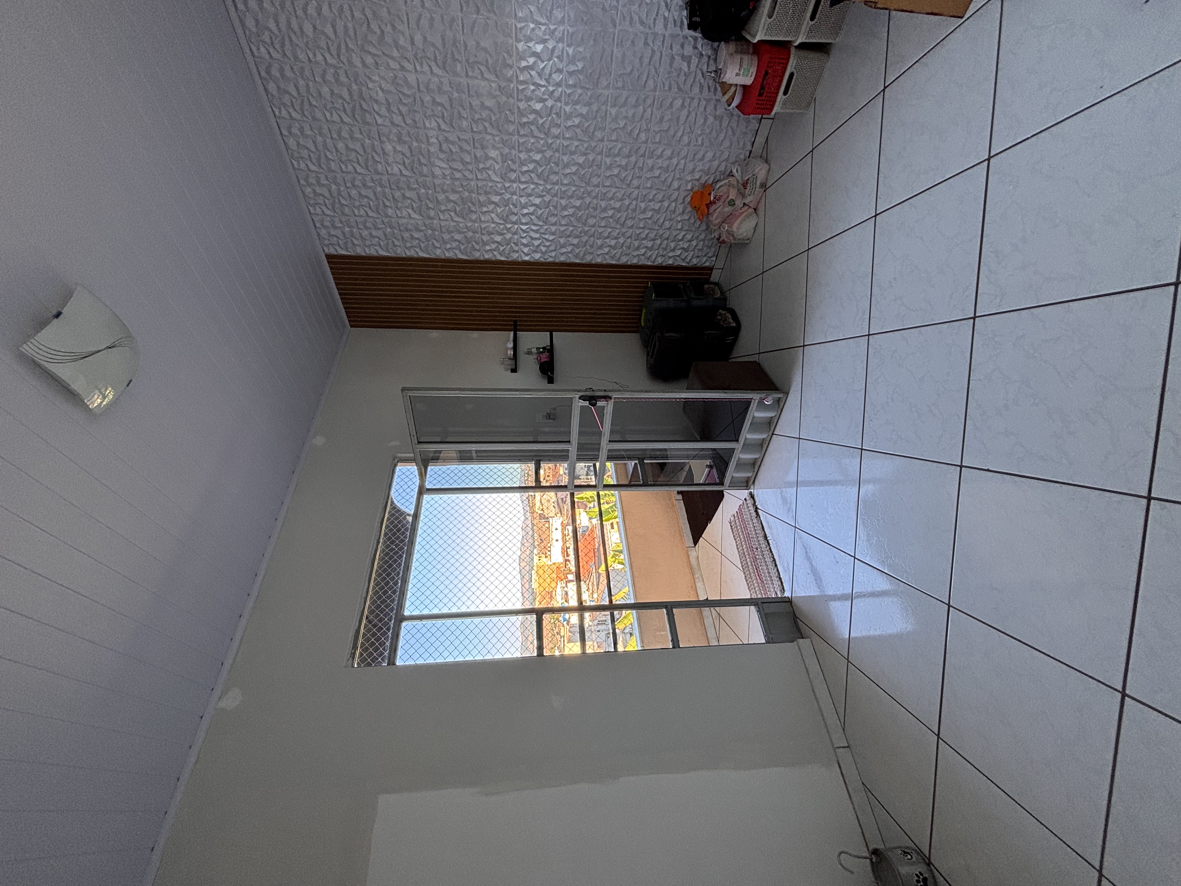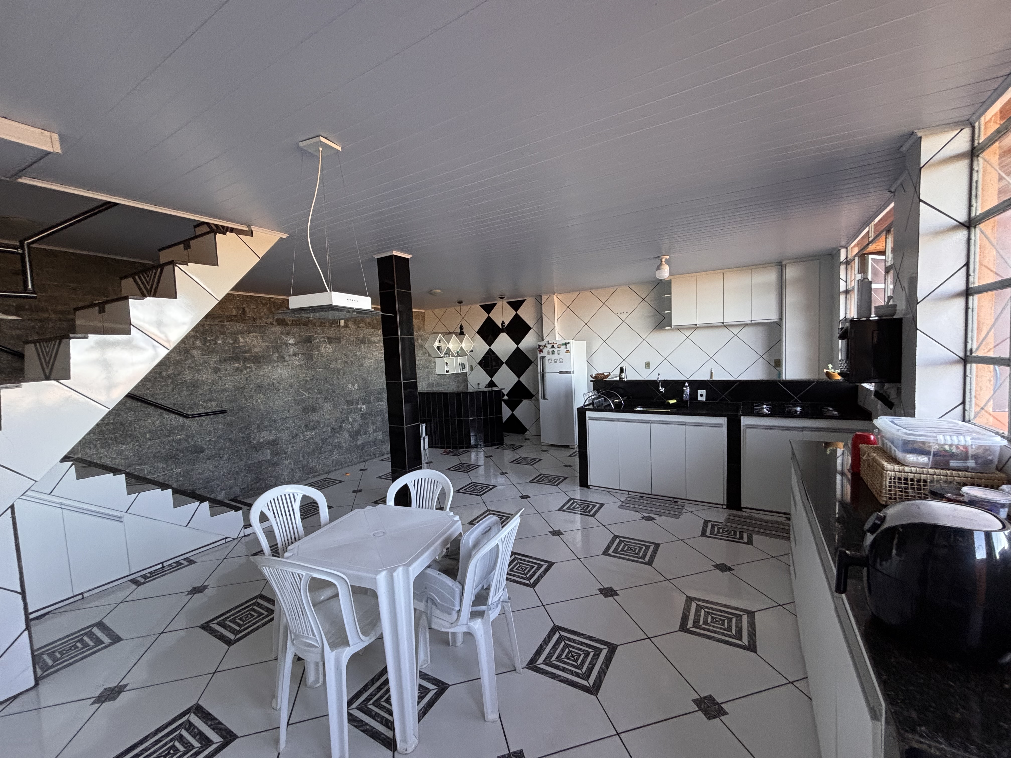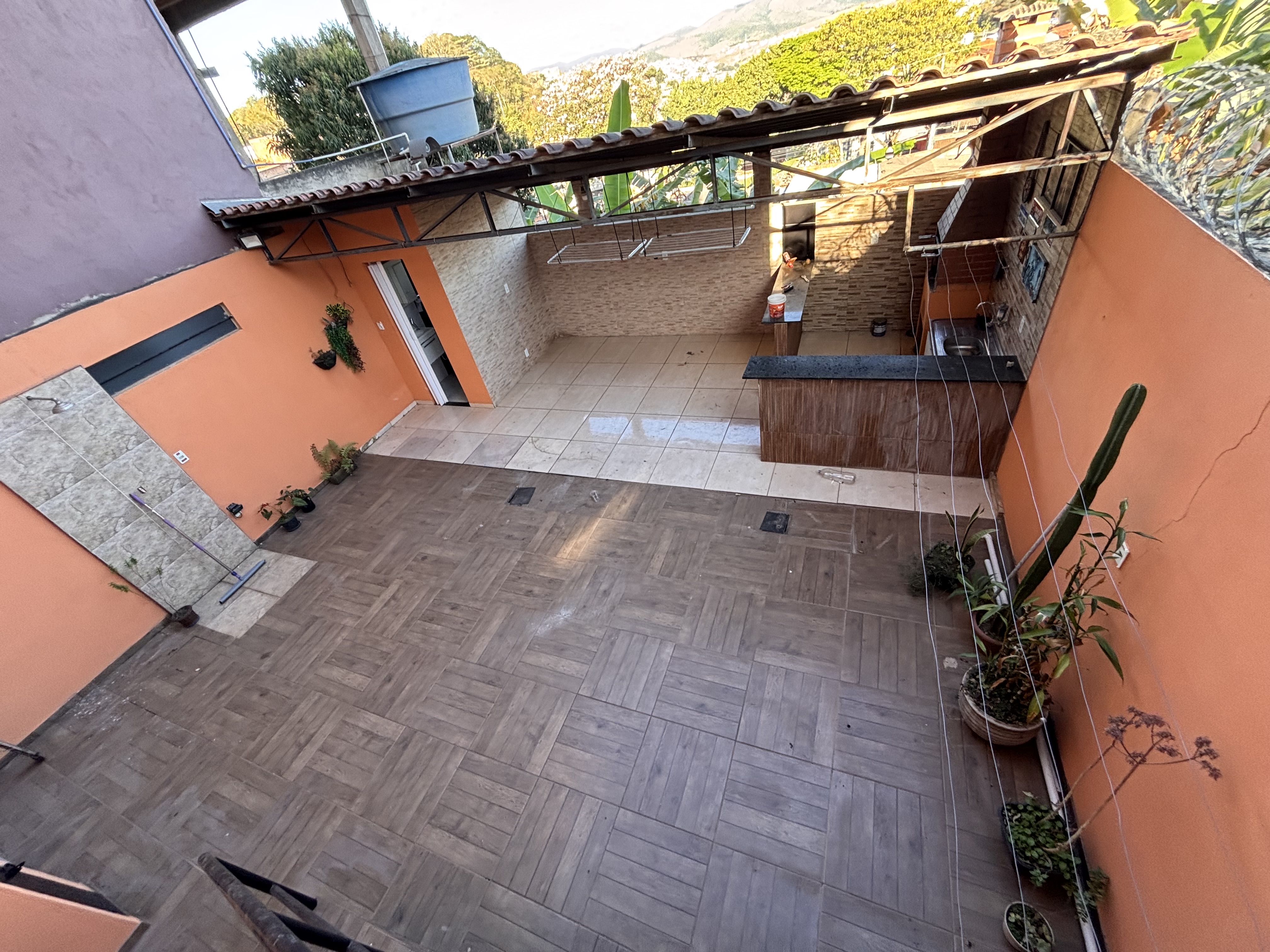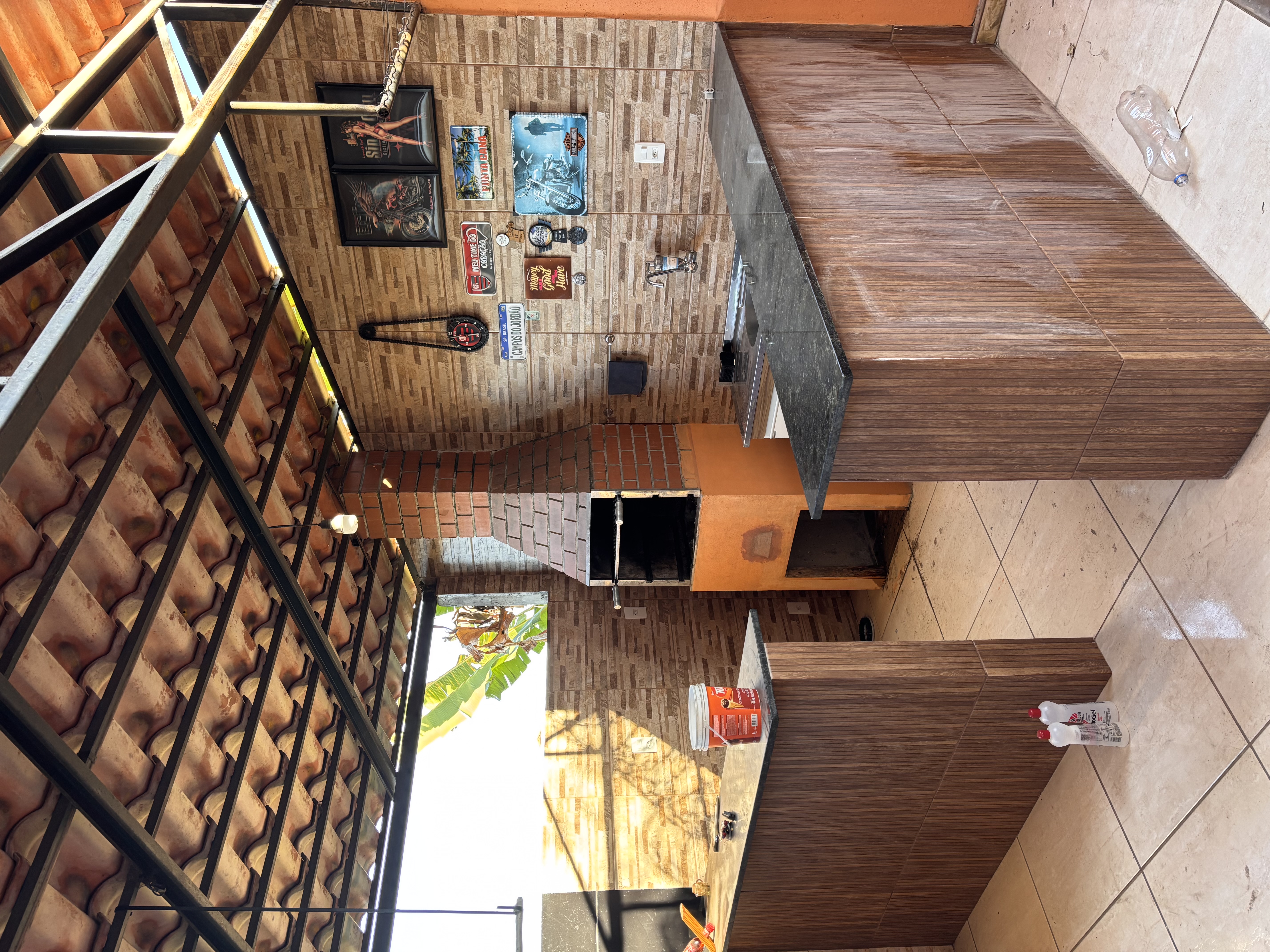 Parte coberta com bancada, 4 banquetas de madeira, churrasqueira à carvão, 1 mesa com 4 cadeiras de plástico, varais suspensos;